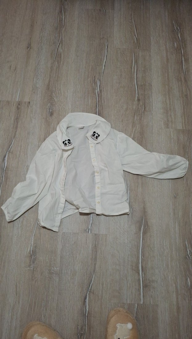 Kız çocukları için keten kumaştan, düğmeli, beyaz uzun kollu ve yakalı gömlek. Yaka kısmında sevimli panda desenleri bulunur.