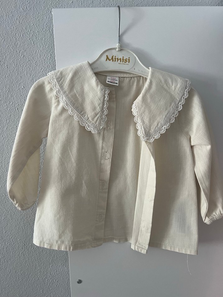 Beyaz keten kumaştan yapılmış, vintage nakışlı yaka ve uzun kollu kız çocuk gömleği. Düğmeli ve rahat kesim, pastel tonlarda.