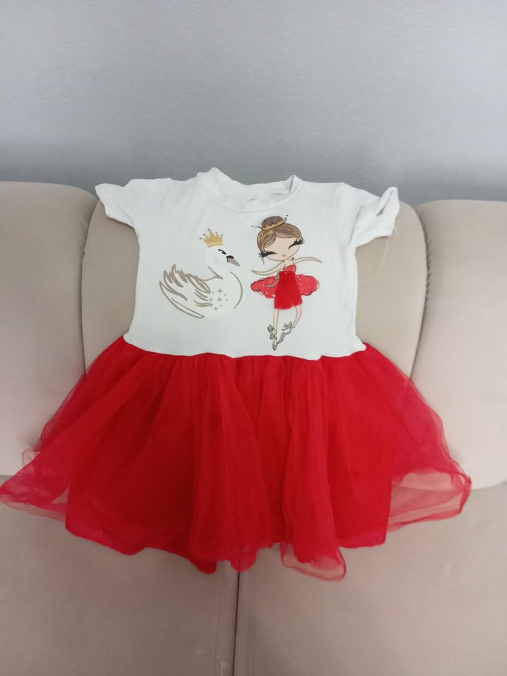 Kısa kollu, straplez yaka ve baskılı desenli kız çocuk elbisesi. Beyaz üst kısmı kırmızı tül etekle renkli ve şık bir görünüme sahiptir.
