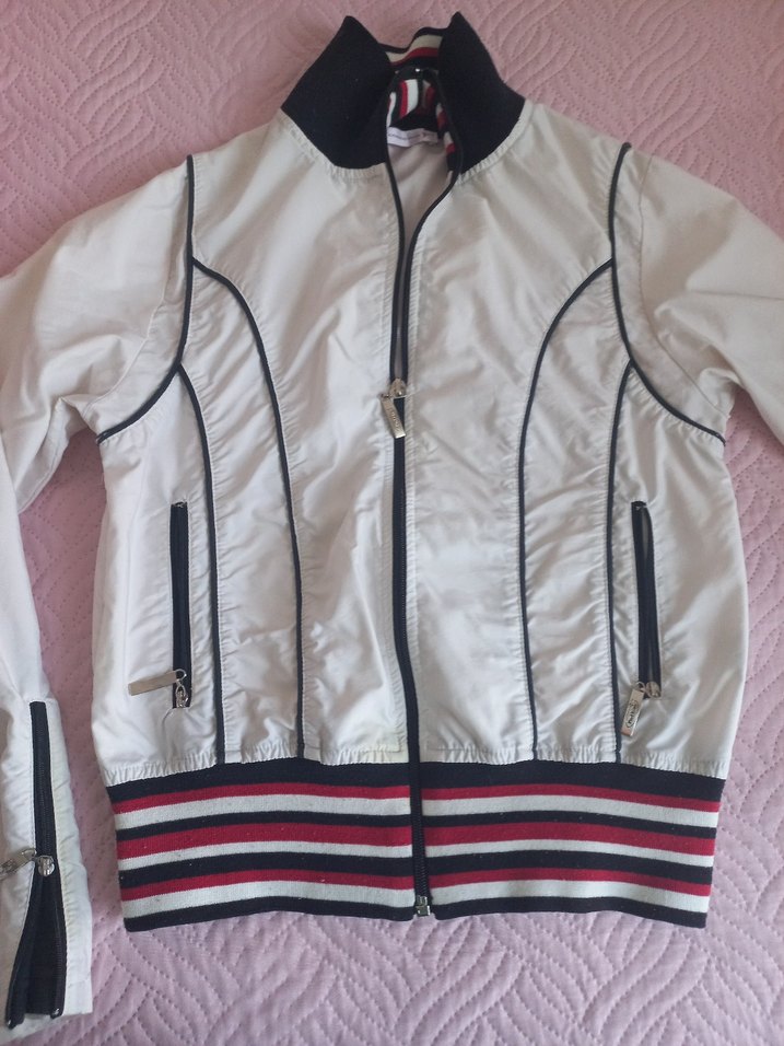 beyaz kısa ceket, uzun kollu ve yüksek yakalıdır. Fermuarlı cepler ve çizgili etek kısmı vardır, sentetik kumaştan yapılmıştır.