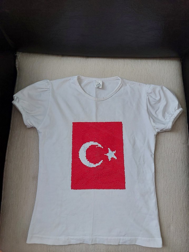 Kısa kollu, yuvarlak yaka, fitted kesim kız çocuk tişörtü.Penye kumaştan üretilmiş olup, üzerinde Türk bayrağı ve Atatürk payet işleme vardır.23 nisan da kullanıldı çok temiz ürün.