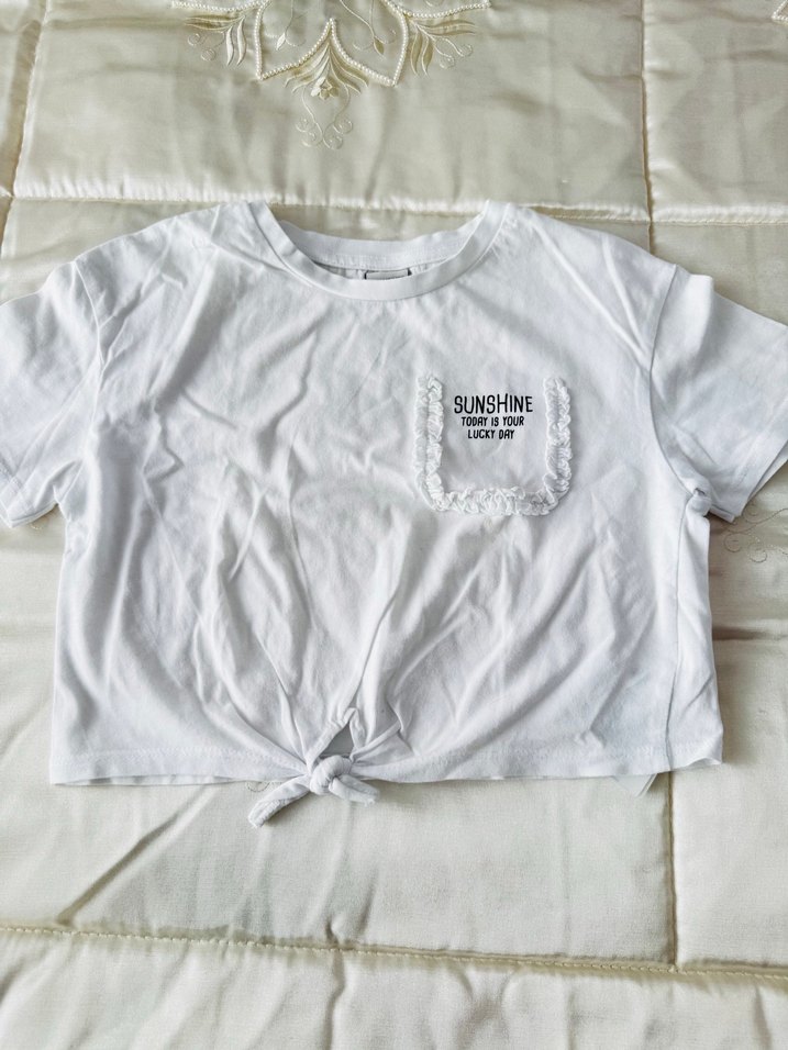 Pamuklu, beyaz, kısa kollu, bol kesim kız çocuk tişörtü. Yuvarlak yakalı, düğmeli cepte 'SUNSHINE' baskısı ve ön bağlama detayı bulunur. ☀️
