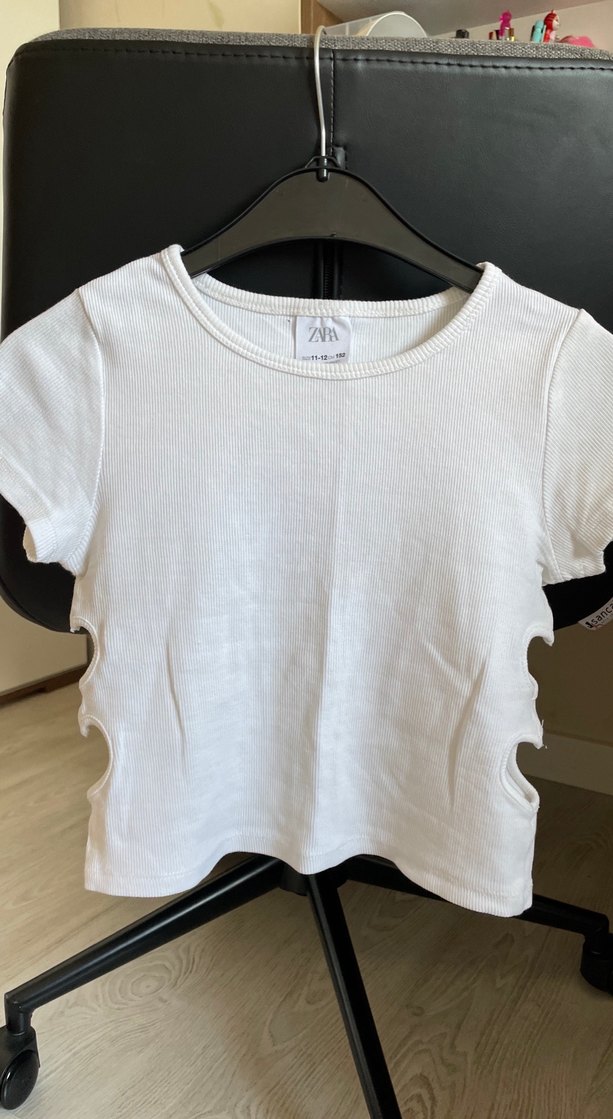 Pamuklu, kısa kollu, bisiklet yaka, yanları gri baskılı baskılı, dar kesim kız çocuk tişörtü, sokak modası tarzında.