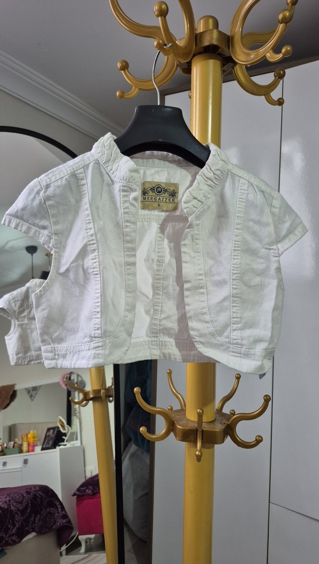 Kız çocuklar için kısa kollu, düğmeli, beyaz bolero. Pamuk kumaştan, dar kesim ve yakası kesik detaylıdır.