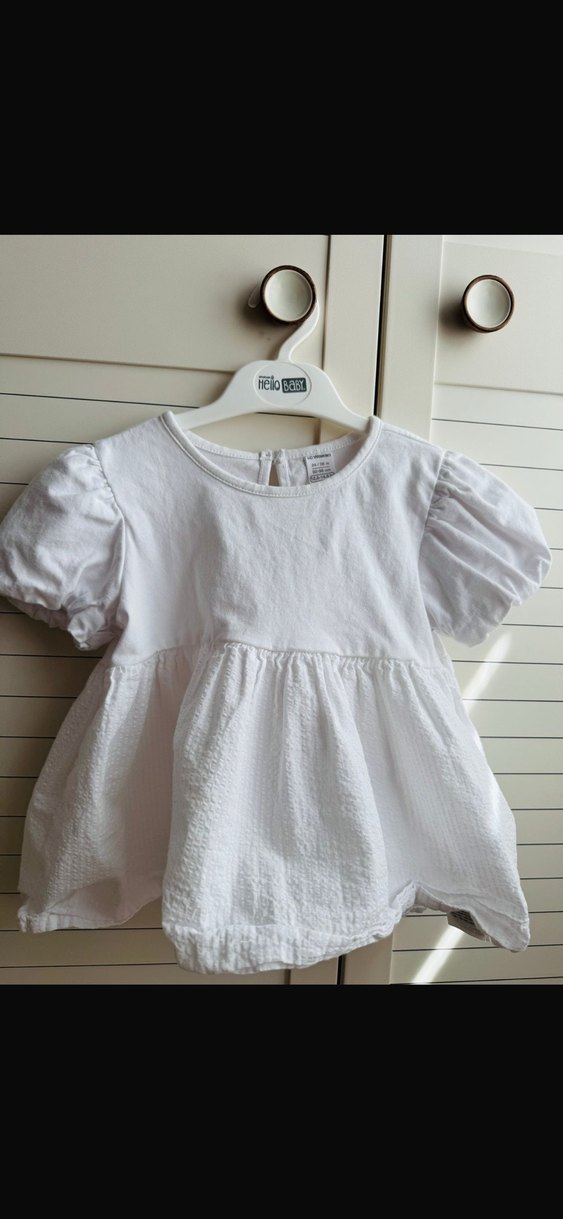 Yepyenidir. Bir kez kullanıldı. Sıfır resmen. Beyaz renkli kız çocuk elbise, kısa kollu ve fırfırlı detaylıdır. Pamuk kumaştan, bol kesim ve yuvarlak yaka ile sade pastel tonlardadır.