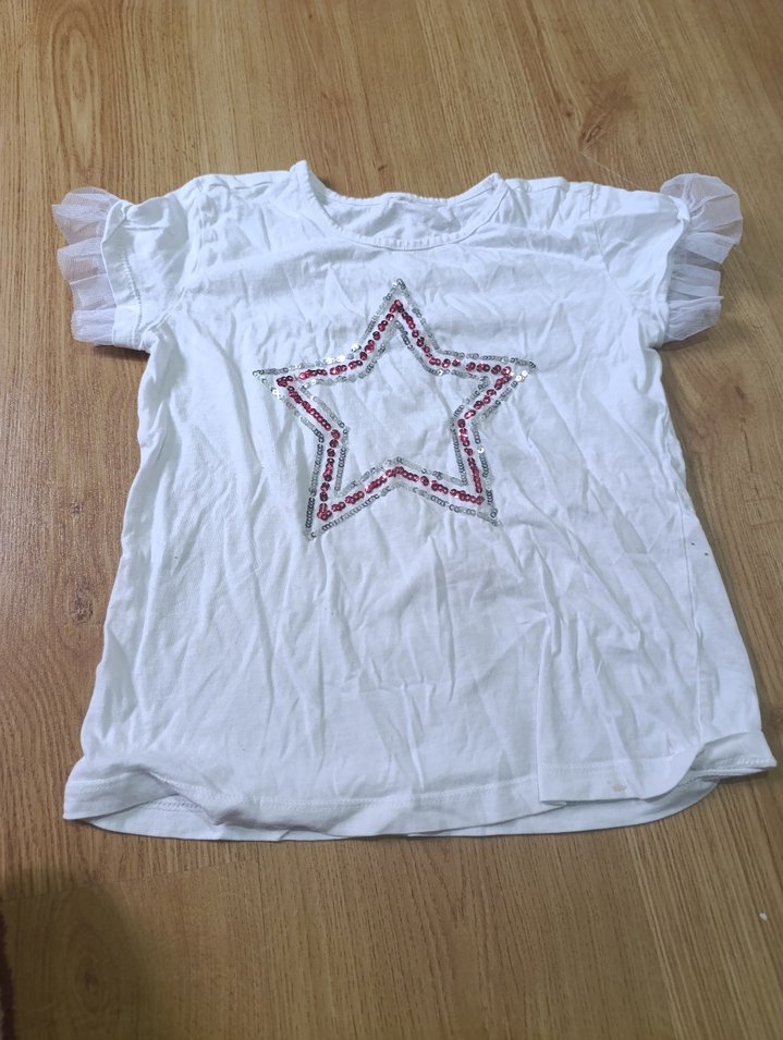 Kız çocuk beyaz tişört, kısa fırfırlı kollar, renkli yıldız baskısı ve yuvarlak yaka ile bol kesimdir.