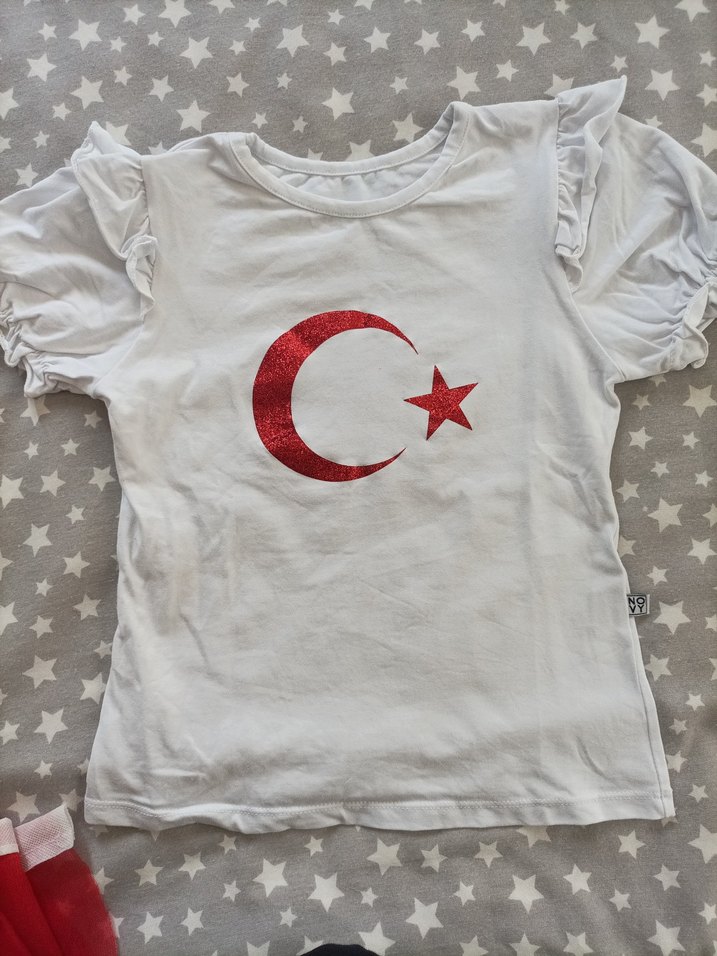 Beyaz, kısa kollu, fırfırlı kız çocuk tişörtü. Yumuşak pamuklu kumaş, parlak kırmızı hilal ve yıldız baskılı, bol kesim ve yuvarlak yaka. sıfır 8-9 yaş