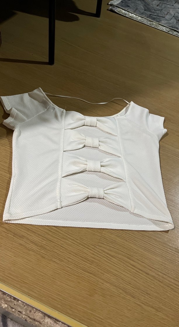 Beyaz, kısa kollu, bisiklet yakalı, önünde üç adet fiyonk süslemeli, sentetik kumaştan yapılmış, vücuda oturan kız çocuk tişörtü.