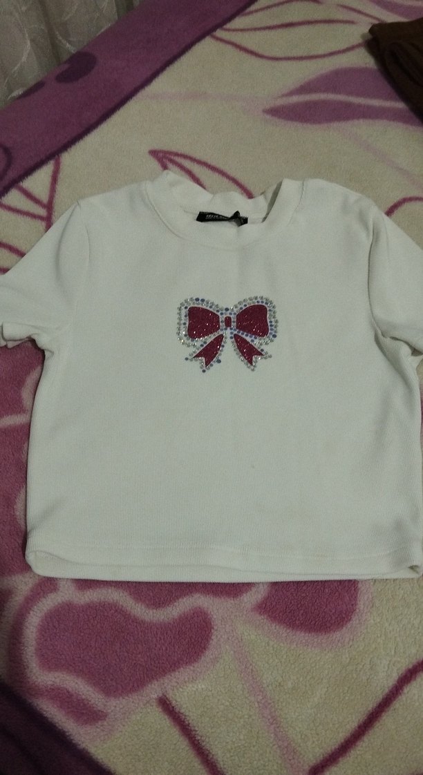 Kısa kollu, bisiklet yaka ve baskılı fiyonk detaylı beyaz kız çocuk tişörtü. Yumuşak sentetik kumaştan, trend sokak tarzı için uygun.