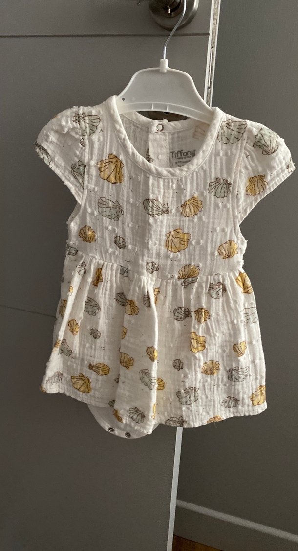 Yumuşak keten kumaştan, kısa kollu, bol kesim kız çocuk elbisesi. Beyaz zemin üzerinde hafif deniz kabuğu desenleriyle bohem tarzda rahat bir model.