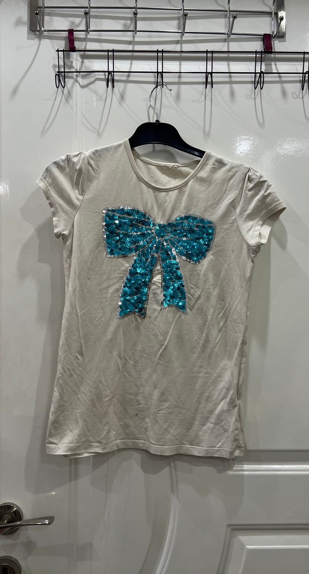 Beyaz renkli, kısa kollu ve bisiklet yaka kız çocuk tişörtü. Ön kısmında mavi payetli büyük fiyonk detayı bulunur. Sentetik yumuşak kumaştan üretilmiştir.