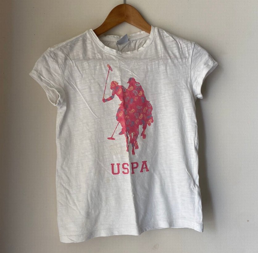 Beyaz, kısa kollu, baskılı USPA logolu kız çocuk polo tişörtü. Yuvarlak yaka ve bol kesim ile rahat bir görünüm sunar.