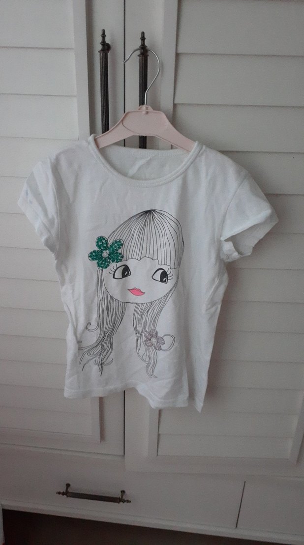 Beyaz renkli, kısa kollu, yuvarlak yakalı kız çocuk tişörtü. Pamuklu kumaştan, rahat kesim ve baskılı, dantel detaylıdır.