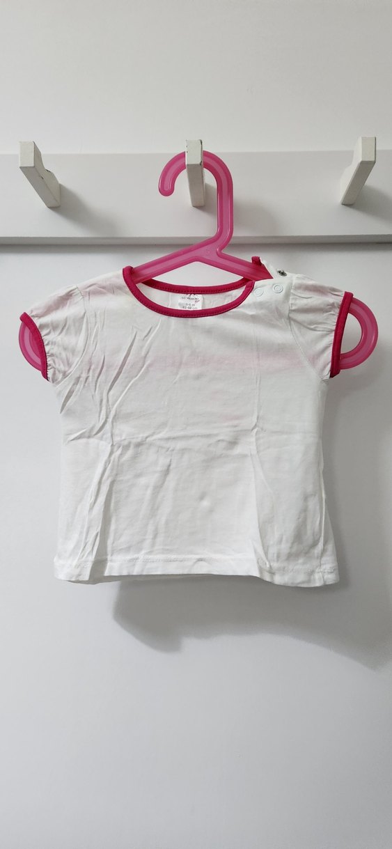 Pamuk kumaştan, kısa kollu, bisiklet yakalı, beyaz renkli kız çocuk tişörtü. Yakada ve kollarda kırmızı detaylar bulunur.