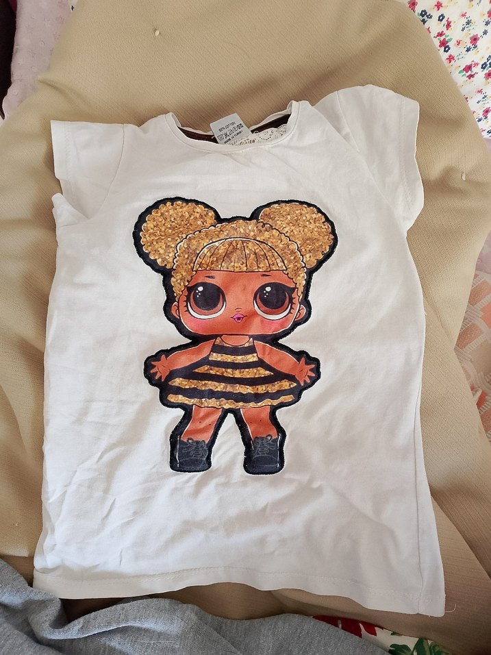 Beyaz renkli, kısa kollu ve geniş kesim kız çocuk tişörtü. Parlak baskılı bebek figürü ve dantel detaylarıyla şık bir görünüm sunar. Yumuşak sentetik kumaştan üretilmiştir. 3-4 yaş.