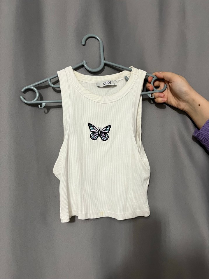 için pamuk kumaştan yapılmış, kolsuz ve straplez yakalı, kelebek baskılı, hafif ve şık sokak stili üst.