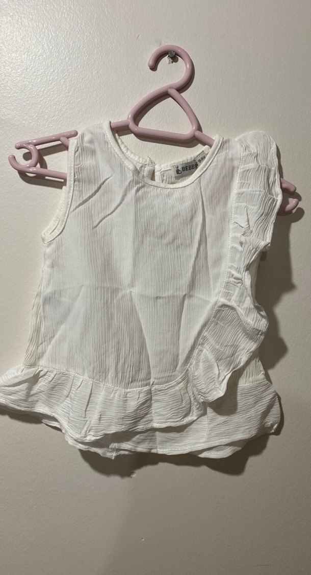 Kız çocuk için keten kumaştan, kolsuz, fırfırlı, salaş kesim ve yuvarlak yakalı beyaz bluz.