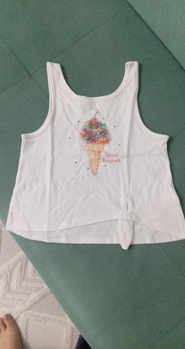 Kolsuz, straplez yaka ve bol kesimli kız çocuk tişörtü. Renkli dondurma baskısı ve fırfır detayları vardır. Pamuklu, rahat kumaştan üretilmiştir.