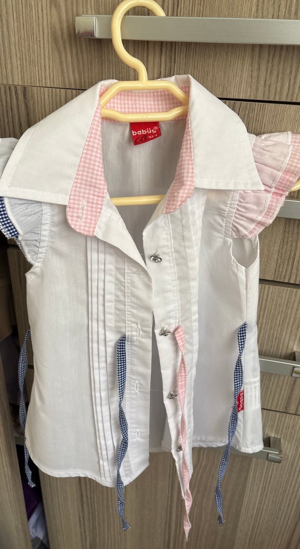 Beyaz kolsuz kız çocuk gömlek, yakalı ve düğmeli. Nakış detaylı, regular fit ve yumuşak sentetik kumaştan, casual streetwear tarzında. 'babus' markalı.