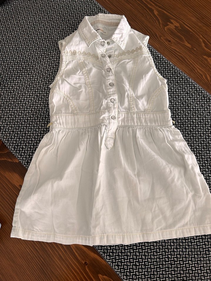 Keten kumaştan yapılmış, kolsuz ve düğmeli, yakalı, nakışlı beyaz parlak kumaşlı bohem tarzı kız çocuk elbisesi. KOTON ELBİSE