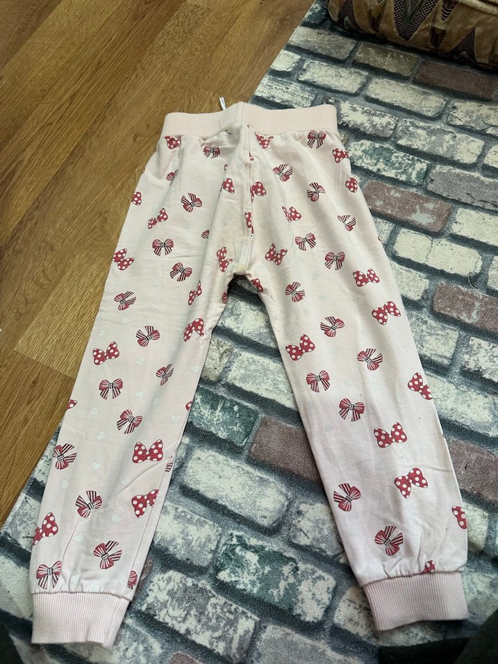 Pamuklu, beyaz zemin üzerine kırmızı kurdele desenli, bol kesim kız çocuk pantolonu. Rahat ve günlük kullanım için uygun, lastikli paçalarla.