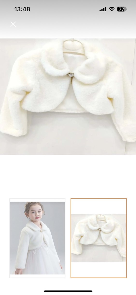 Kız çocuklar için beyaz, uzun kollu, kürk detaylı, straplez yakalı ve dar kesim bolero. Yumuşak ve sıcak dokusuyla klasik şıklık sunar. ❄️