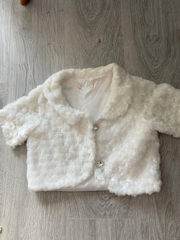 Kız çocukları için beyaz, kürk detaylı, yarım kollu, yakalı, sade ve modern klasik tarzda, vücuda oturan bolero. Yumuşak dokusuyla sıcaklık sağlar. ❄️iki kol arası 42 omuzdan boy 35 cm