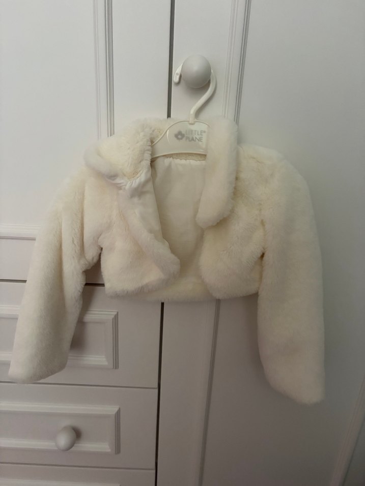Ekru renkte, uzun kollu ve kürk detaylı, kesimi vücuda oturan kız çocuk bolero.