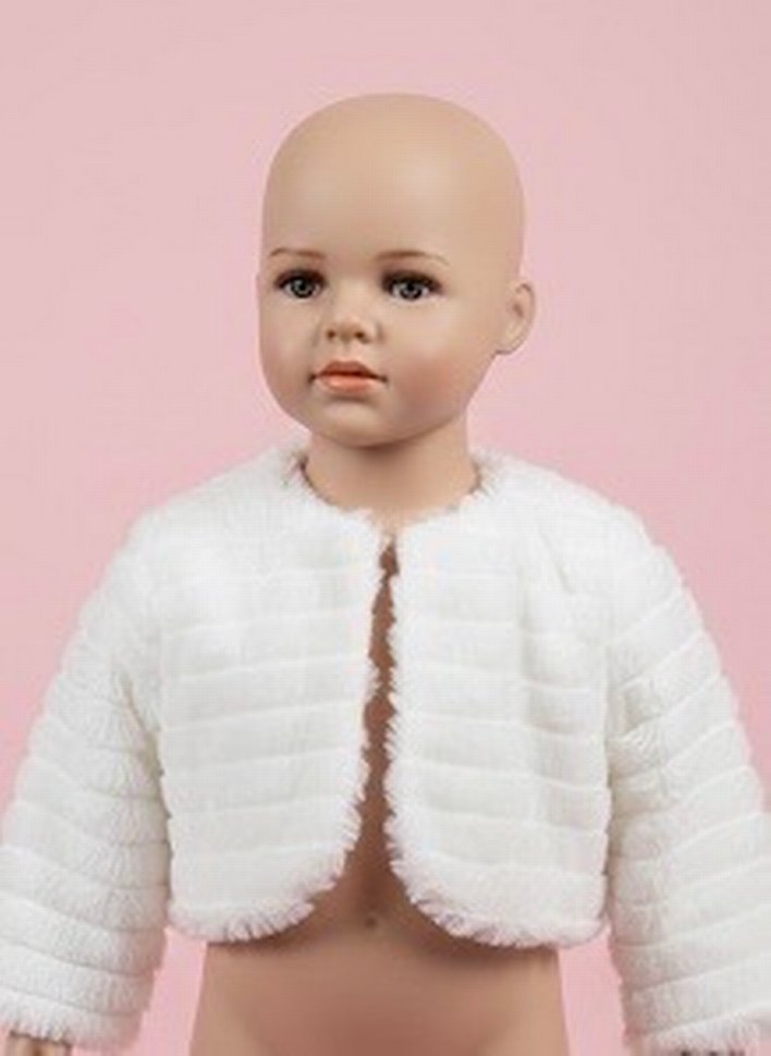 Butik ürünü Kız çocukları için uzun kollu, yuvarlak yakalı, yumuşak ve sıcak kumaştan, beyaz pastel renkte kürk detaylı bolero.
