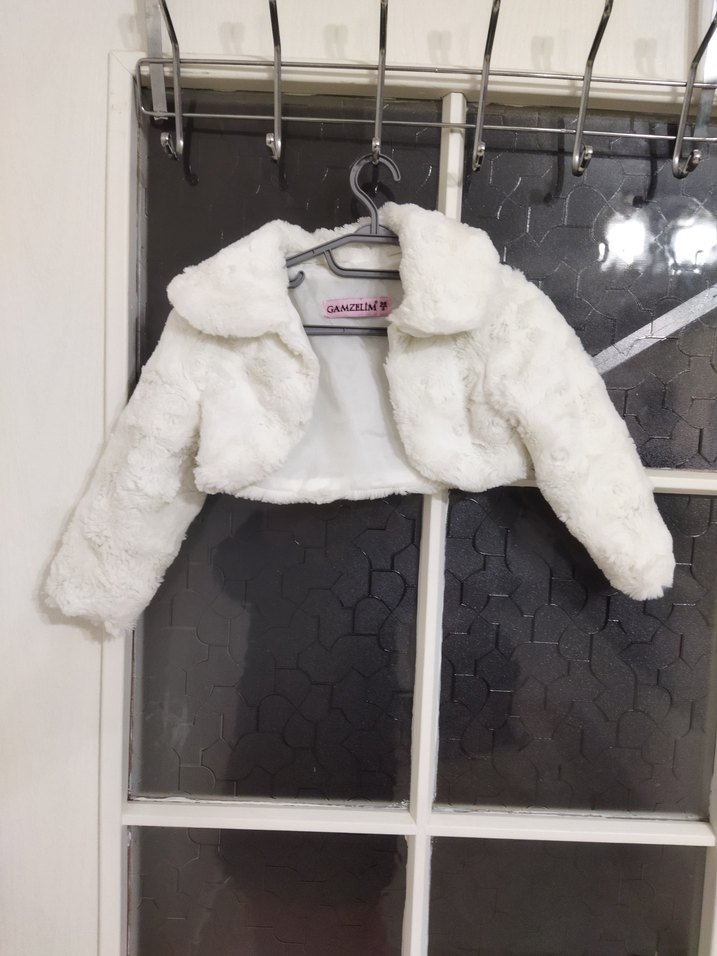 Bolero Gamzelim marka 3 yaş üstü kalın kürklü içi astarlı kırık beyaz çok şık bir bolero az kullanılmış hiç bir sorunu deformasyonu yok koltuk altından koltuk altına genişlik ölçüsü 30 cm boy uzunluğu 20 cm ihtiyaç fazlası Kız çocukları için uzun kollu, kürk detaylı, yumuşak ve sıcak dokulu beyaz bolero. Notlu yaka ve sokak modası tarzında tasarlanmıştır.