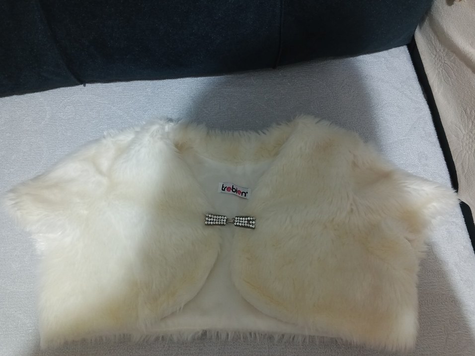 Kız çocukları için beyaz renkli, kürk detaylı, yumuşak ve sıcak kumaştan yapılmış, yakası kesimli ve kolsuz bolero. Düz ve hafif renklidir, katmanlama için uygundur. ✨
