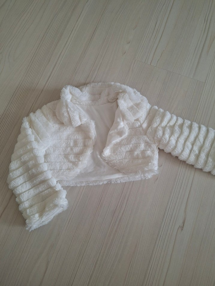 Kız çocukları için uzun kollu, straplez yaka ve kürk detaylı, hafif beyaz renkte, yumuşak ve sıcak kumaştan yapılmış bolero.Sadece 1 kez giyilmiştir.