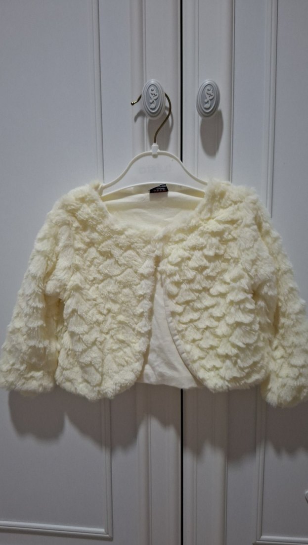 Uzun kollu, yuvarlak yakalı beyaz kız çocuk bolero, yumuşak kürk detaylarıyla modern klasik tarz sunar. Şık görünüm için idealdir. ❄️