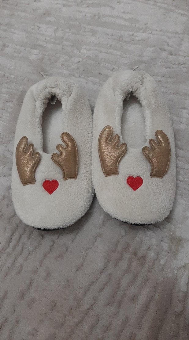 Yumuşak kumaştan kız çocuk beyaz ev terliği, kırmızı kalp ve altın renkli işlemeli kürk detaylı. Rahat ve sıcak tutar.