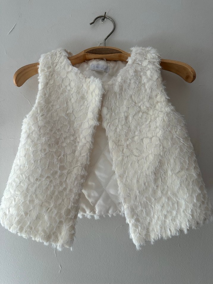 Kız çocuk için triko peluş kumaştan yapılmış, parlak beyaz kürk detaylı, desensiz ve bohem tarzda dar kesim yelek. 4-5 yaş için