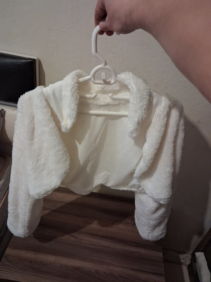 Kız çocukları için uzun kollu, straplez yakalı, beyaz ve kürklü detaylı, yumuşak ve sıcak dokulu bolero. ❄️