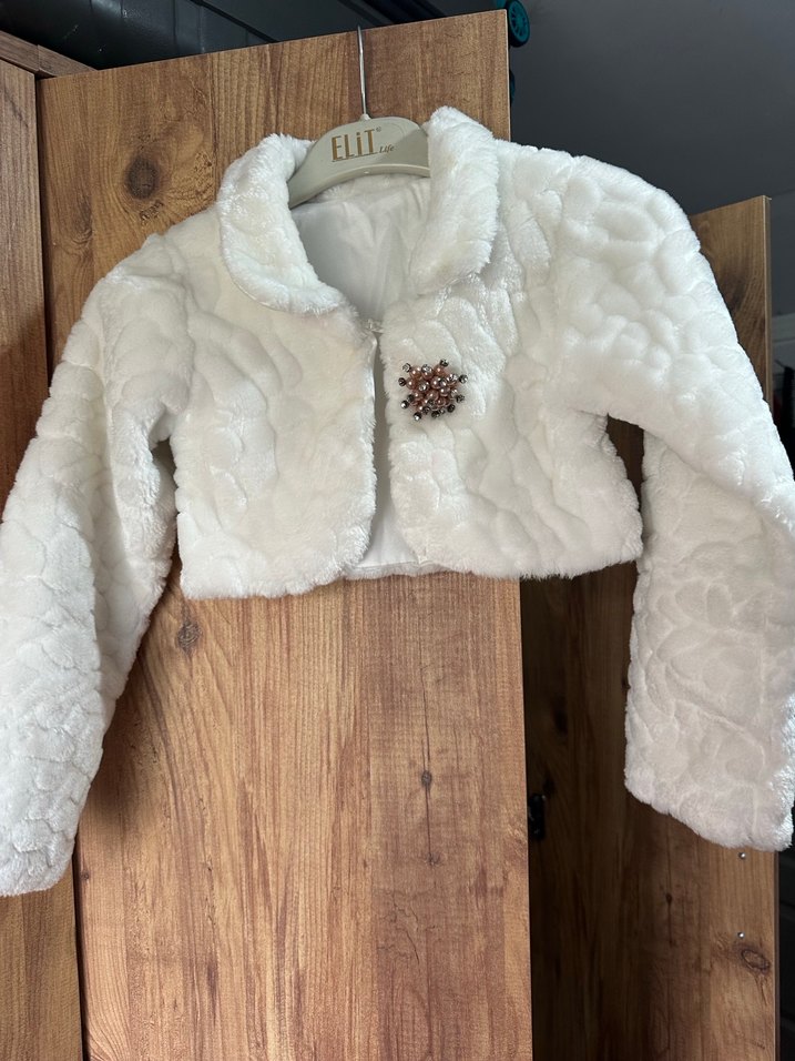 Uzun kollu, kürklü detaylı beyaz bolero. Nakışlı ve parlak desenleriyle klasik ve sokak tarzını birleştirir. ELIT markasına ait, şık ve sıcak tutar. ❄️