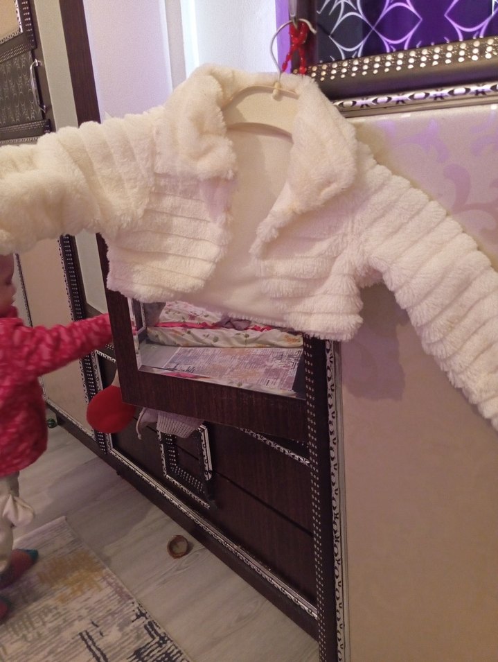 Kız çocukları için beyaz, uzun kollu, straplez yakalı ve kürklü detaylı, yumuşak ve sıcak kumaştan yapılmış dar kesim bolero. ❄️