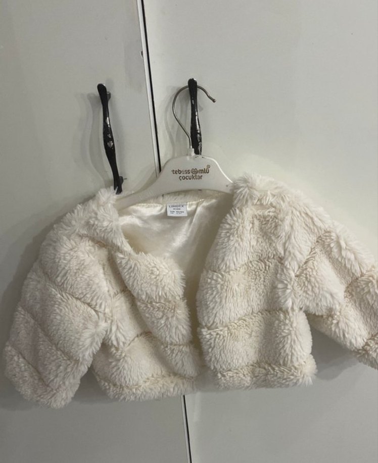 Kız çocukları için beyaz renkte, kürklü detaylara sahip, uzun kollu ve straplez yakalı, yumuşak ve sıcak kumaştan yapılmış dar kesim bolero. Yurtdışından alındı