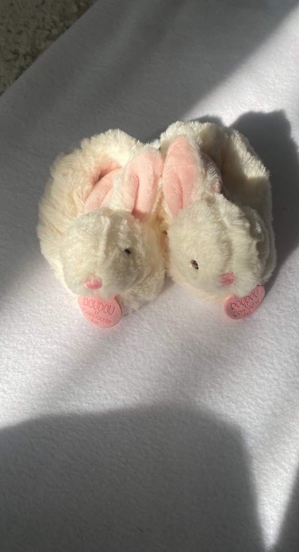 Kız çocukları için beyaz, yumuşak ve sıcak kumaştan yapılmış, kürklü ve işlemeli tavşan yüzlü patik