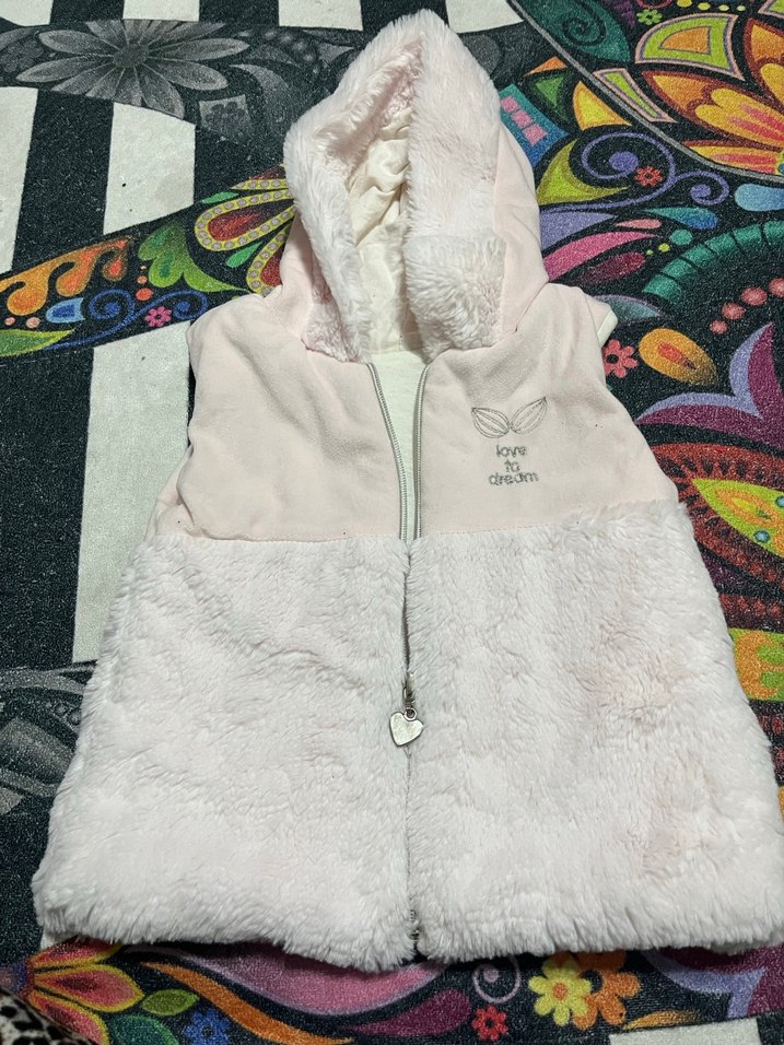 Kapüşonlu, kolsuz beyaz yelek, yumuşak kürk detaylı ve vücuda oturan kesimde. Kalp ve yazı baskılı, günlük kullanıma uygun.