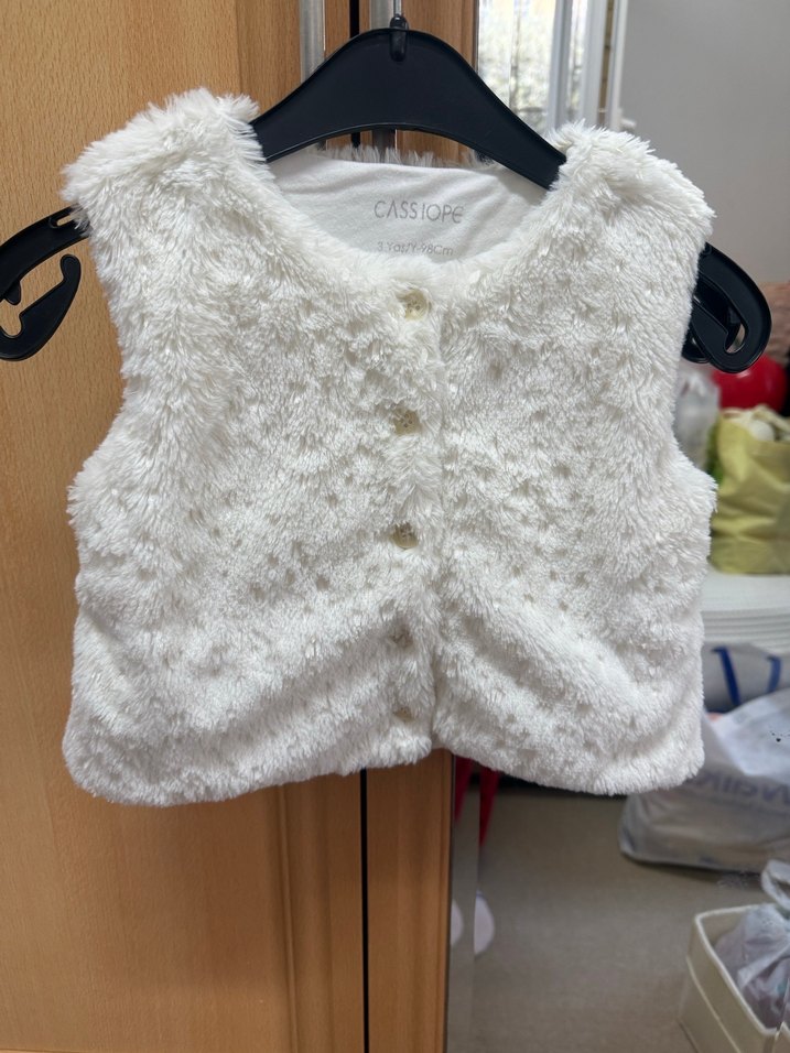 Kız Çocuk Beyaz Kürklü Kolsuz Yelek Kız çocukları için beyaz renkte, yumuşak ve sıcak kumaştan, kürk detaylı, kolsuz ve straplez kesime sahip dar kesim yelek. Düz ve desensiz, sokak stiline uygun. 3 Yaştır Kalıbı Dardır 1-2 Yaşada Uygundur Hiçbir Kusuru Yoktur 1 Kere Giyilmiştir Sadece