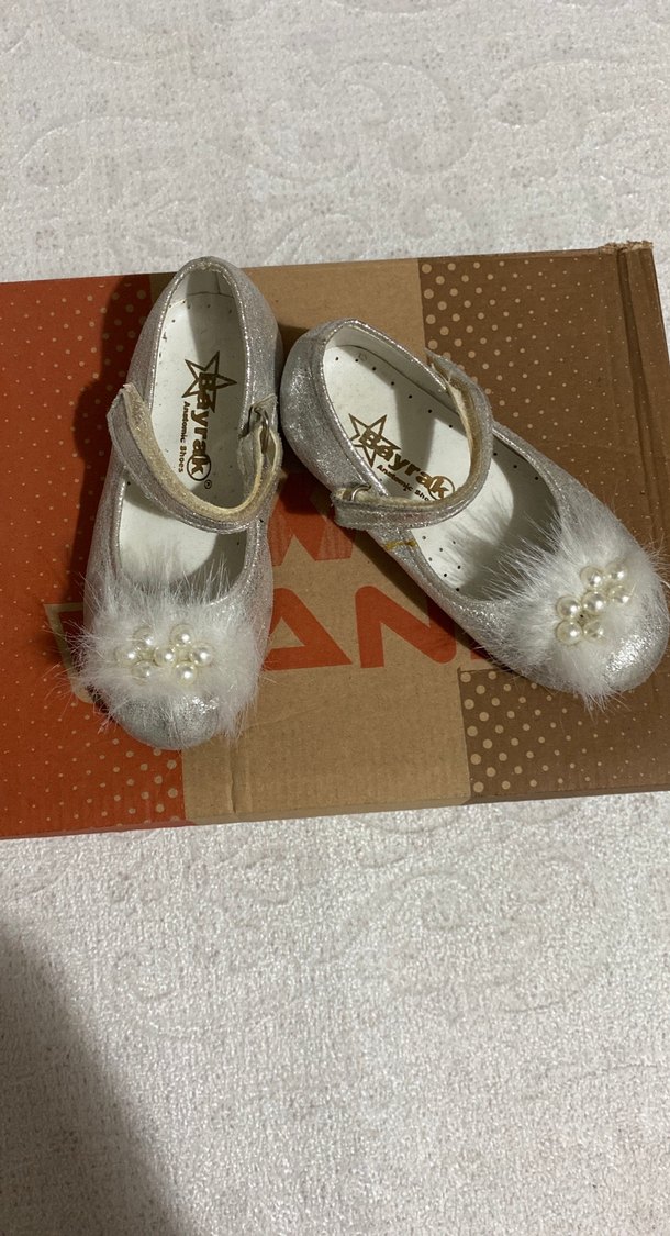 Kız çocukları için beyaz babetler, uç kısmında kürk ve nakışlı inci detayları bulunur. Gri bantlı ve yumuşak kauçuk tabanlıdır.