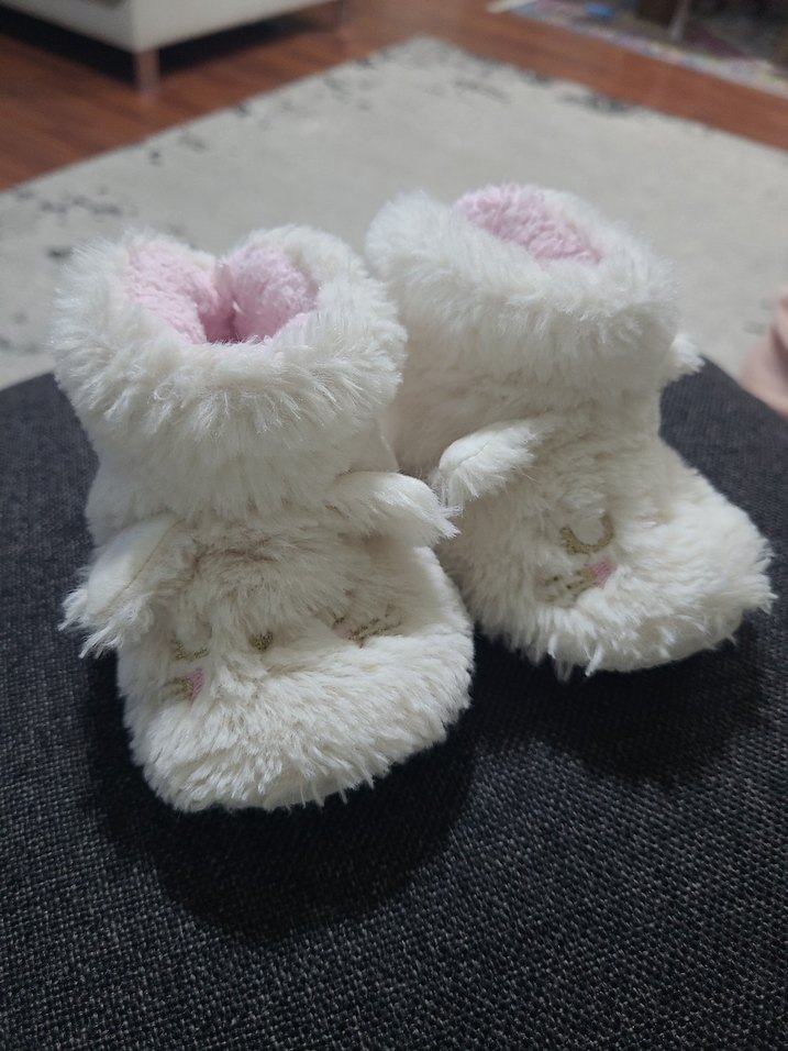 Kız çocukları için beyaz, yumuşak kürk detaylı ve nakışlı, içi rahat peluş astarlı sıcak ev terliği.