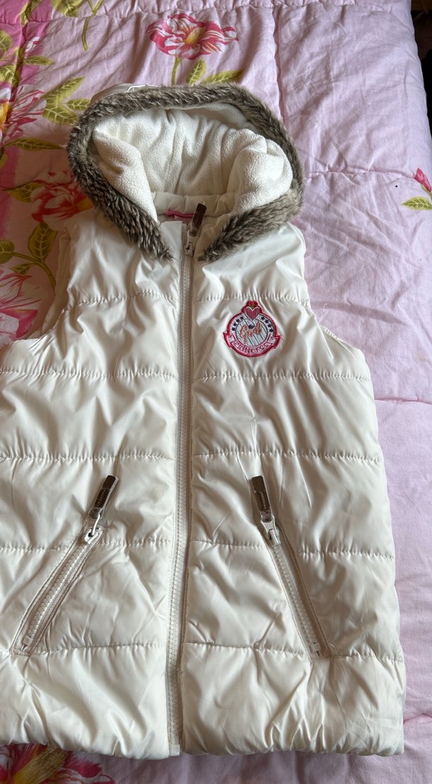 Beyaz, sıfır kol ve fitted kesim kız çocuk yeleği. Nakışlı detaylar ve kürk kapüşonlu, yumuşak ve sıcak kumaşlı.