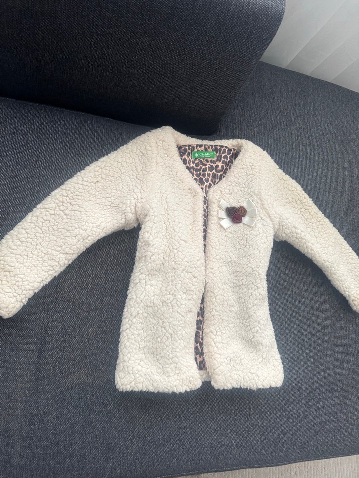 Kız çocukları için bol kesim, kürklü, yuvarlak yakalı ve yumuşak dokulu beyaz ceket. İç kısmı gri ve süslü fiyonk detayı bulunur.