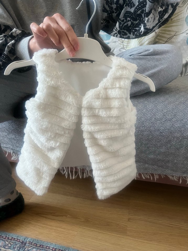 Triko kumaştan yapılmış, straplez yaka ve kürk detaylı beyaz, fitted kız çocuk yeleği. Sokak modasına uygun.