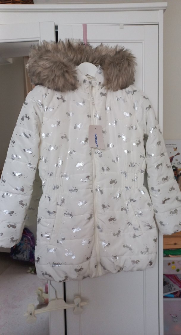 Yeni Etiketli Kapüşondaki kürk çıkıyor. belden oturtmalı ici polarlı sıcak tutan. Kız çocukları için beyaz unicorn baskılı mont