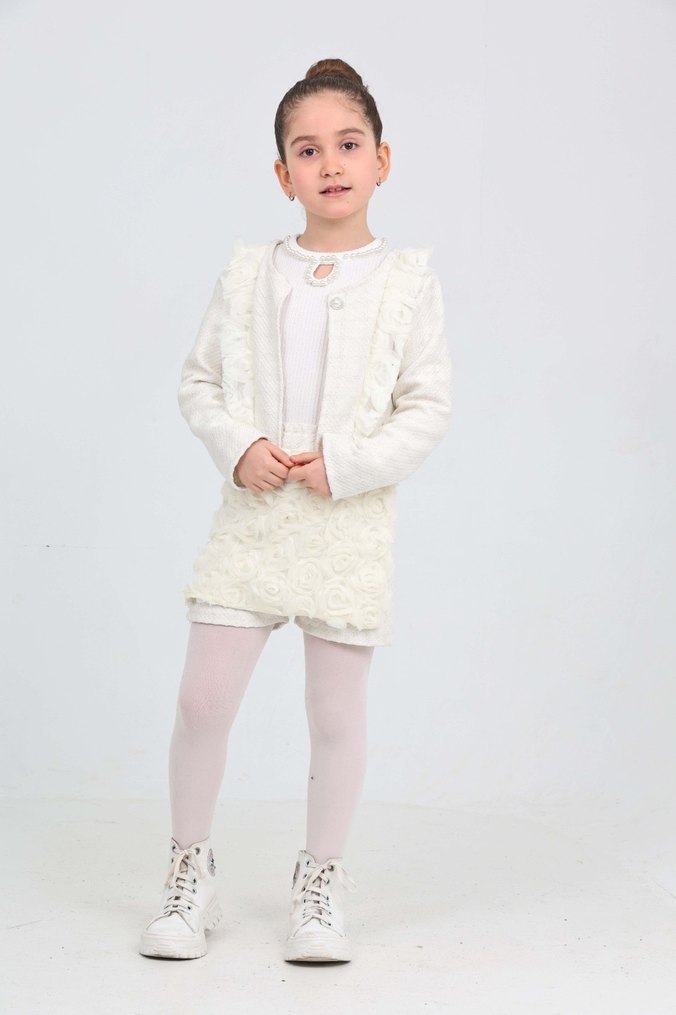 Beyaz, kız çocukları için özel kesim, uzun kollu ve kürklü detaylı bolero. Notch yaka ve yumuşak, sıcak dokusu ile trend günlük giyim için uygundur. ❄️