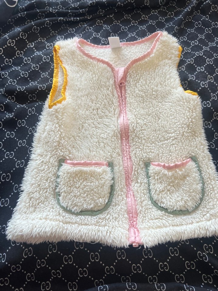 Kız çocukları için beyaz, kürk detaylı, nakışlı ve pastel renkli kenarları olan, kolsuz ve dar kesim yelek.